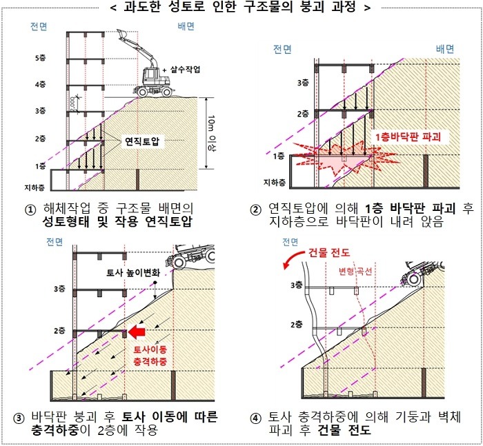 이어 사조위는 지하층으로 성토가 급격히 유입되면서 상부층 토사의 건물전면 방향 이동에 따른 충격이 구조물 전도붕괴의 직접원인으로 나타났다고 밝혔다. 이 때 살수작업의 지속, 지하층 토사 되메우기 부족 등 성토작업에 따르는 안전검토 미비 및 그 외 기준 위반사항도 조사했다.