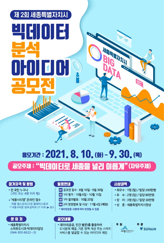 세종특별자치시는 10일부터 오는 9월 30일까지 전 국민을 대상으로 ‘제2회 빅데이터 분석 아이디어 공모전’을 개최하고 아이디어를 받는다.