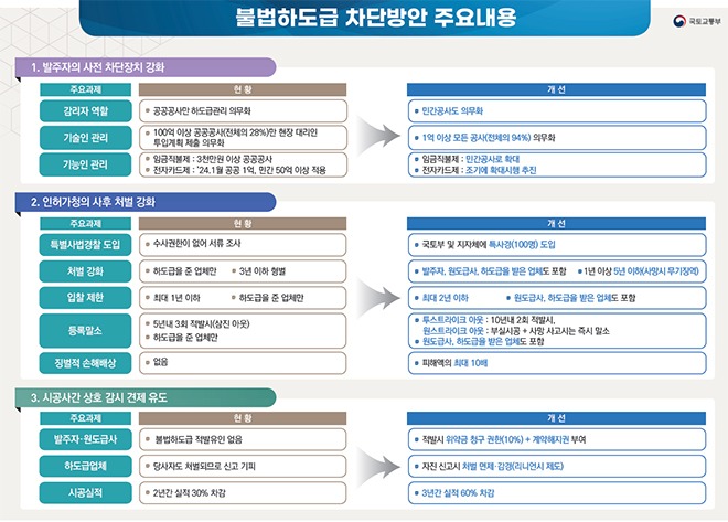 이를 위해 불법하도급에 대한 발주자의 사전 차단장치와 인허가청의 사후 처벌기능을 강화하고 시공사 간 경제적 이해관계의 고리를 끊어 불법의 공생구조를 상호 감시와 고발 구조로 전환할 방침이다.