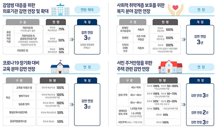 먼저 코로나19 등 감염병의 예방·진료 지원을 위해 지방의료원 등 의료기관의 취득세와 재산세 감면이 3년 연장되고, 감염병 전문병원의 취득세와 재산세도 각각 10%p 추가로 감면된다.