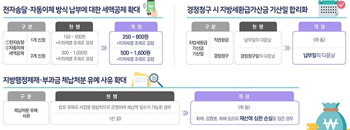 이와 함께 납세자들의 권익 보호 강화를 위해 전자송달·자동이체 방식 납부에 대한 세액공제 한도를 확대하고, 경정청구 시 지방세환급가산금 기산일을 합리화한다.