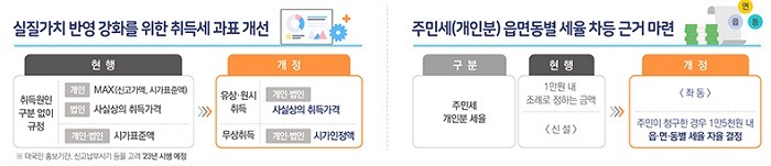 취득세 과세대상의 실질가치도 제대로 반영될 수 있도록 취득세 과세표준 제도를 개선해 앞으로는 사실상 취득한 가격을 과세표준으로 한다. 다만 취득가격 관련 자료 시스템 구축 등을 고려해 1년의 준비기간을 거쳐 2023년 시행할 예정이다.