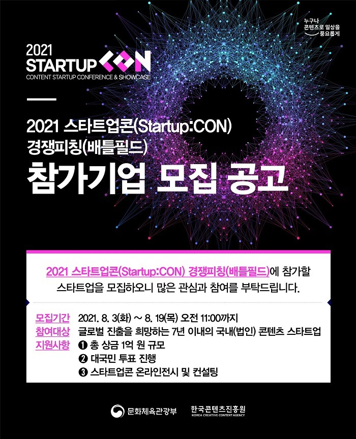 문화체육관광부와 한국콘텐츠진흥원(이하 콘진원)은 ‘2021 스타트업콘 (STARTUP:CON, 이하 스타트업콘)’에서 국내 우수 콘텐츠 스타트업의 글로벌 진출을 지원하기 위한 ‘경쟁피칭(배틀필드)’에 참가할 스타트업을 오는 19일까지 모집한다.