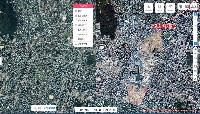 우선 항공사진을 2020년 기준으로 확인할 수 있다. 경기부동산포털은 국토지리정보원에서 2010년부터 2018년까지 2년 주기로 촬영한 항공사진을 제공한 바 있다. 지도서비스, 포털맵 비교(아이콘), 경기부동산포털맵, 지도선택 순으로 메뉴를 누르면 과거 항공사진(2010년, 2012년, 2014년, 2016년, 2018년)과 2020년 최신 항공사진을 비교해 지형지물의 변화 등을 살필 수 있다.