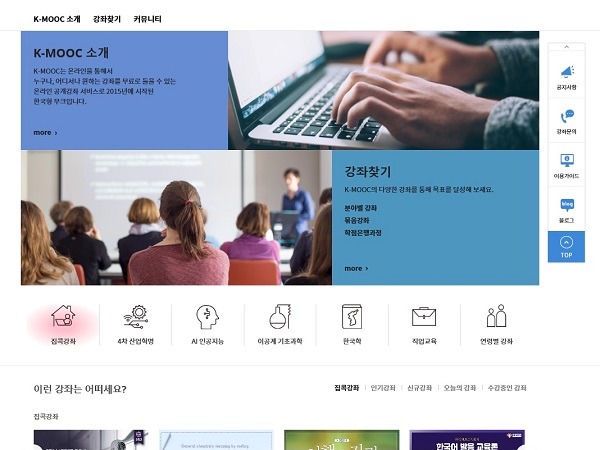 교육부와 국가평생교육진흥원이 손을 잡고 시작한 한국형 온라인 공개 강의인 K-MOOC 사이트.