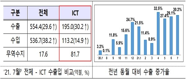 산업통상자원부가 12일 발표한 ‘2021년 7월 ICT 수출입 동향’을 보면 지난달 ICT 수출액은 지난해 같은 기간보다 30.2% 늘었고, 수입은 113억 2000만 달러로 14.9% 증가해 무역수지는 81억 7000만 달러 흑자를 기록한 것으로 나타났다.