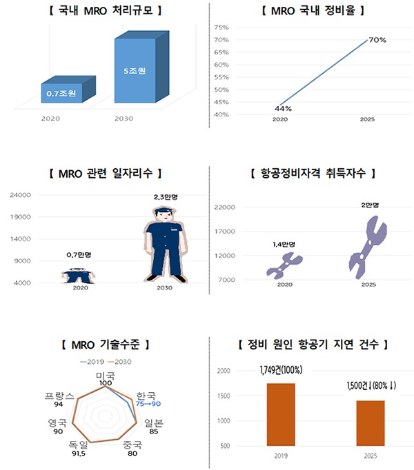정부가 2025년까지 국내 항공정비(MRO)산업 물량 중 70%를 국내에서 처리하고 2030년까지 국내 MRO 시장규모를 5조원으로 확대한다. 2030년까지 관련 분야에서 2만 3000명의 일자리도 창출할 계획이다.