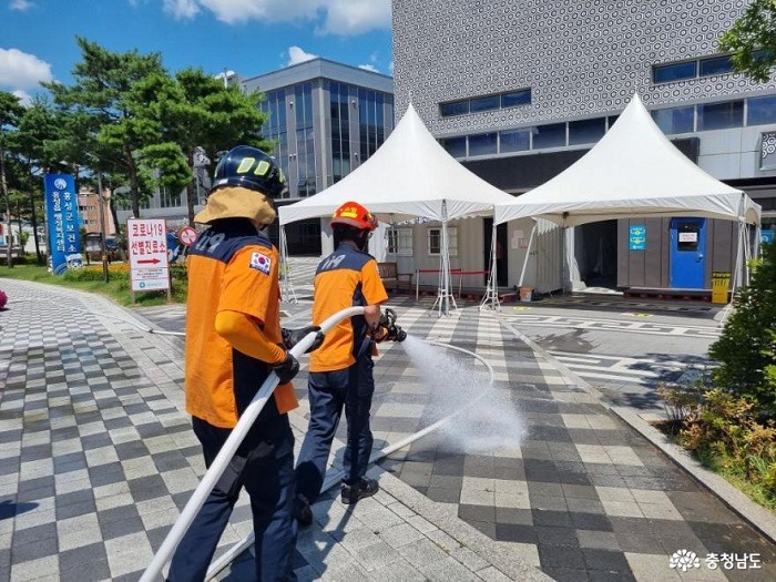 충남소방본부는 폭염으로부터 코로나19 선별진료소를 방문하는 도민과 의료진 보호를 위한 살수 지원이 큰 효과를 보고 있다고 13일 밝혔다.