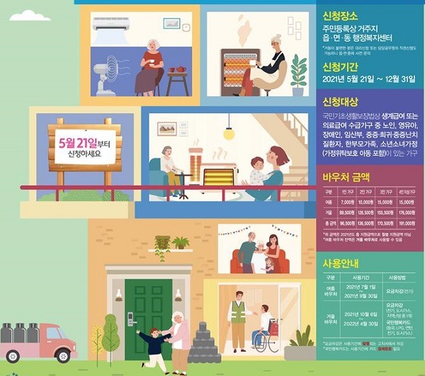 에너지 바우처 사용은 하절기의 경우 7월 1일 부터 9월 30일까지, 동절기는 10월 6일부터 2022년 4월 30일까지 사용 가능하다. 신청은 주민등록상 읍·면·동 행정복지센터를 방문하거나 복지로(http://online.bokjiro.go.kr)에서 온라인으로 신청할 수 있다.
