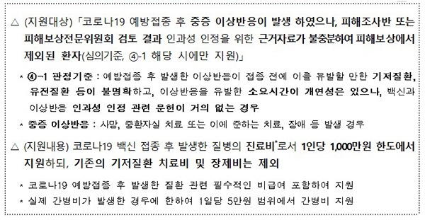 코로나19 예방접종 대응추진단은 코로나19 예방접종 후 인과성 근거가 불충분해 보상에서 제외된 중증 환자에 대해서도 의료비 지원사업을 신설해 1인당 1000만원까지 진료비를 지원하고 있다.