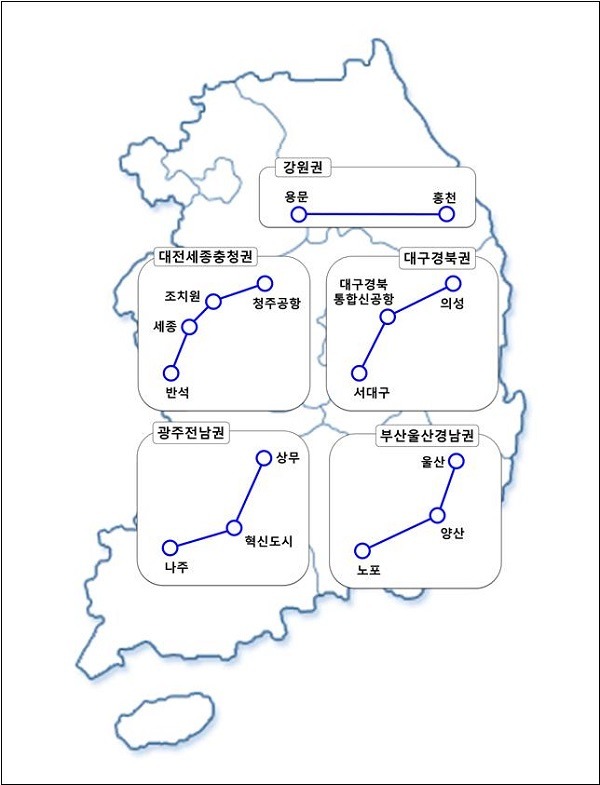 부산~양산~울산, 대구~경북, 광주~나주, 대전~세종~충북, 용문~홍천 광역철도 등 권역별 1개씩 모두 5개 노선 사업이 선도사업으로 선정됐다.