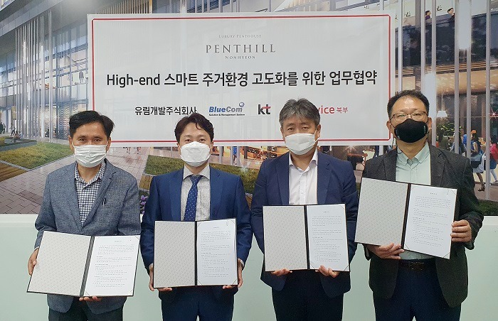 KT와 KTS북부는 AI 주거관리 솔루션기업 블루컴, 부동산 개발회사 유림개발과 함께 AI 스마트홈 서비스를 공동 제공하기 위한 업무협약을 13일 체결했다고 17일 밝혔다.