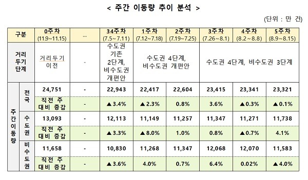같은 기간 수도권의 주간 이동량은 1억1738만건으로, 전주 이동량인 1억1271만건 대비 4.1%(467만건) 증가했으며, 비수도권 주간 이동량은 487만건(4.0%) 감소했다.