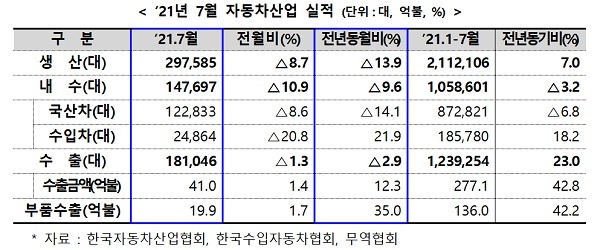 지난달 우리나라 자동차 생산과 내수, 수출이 차량용 반도체 수급 차질 등으로 감소했다. 다만 수출금액은 두자릿수 이상 증가했고, 친환경차 수출 대수와 금액은 월간 기준으로 역대 최고치를 기록했다.