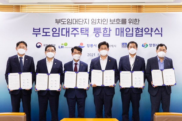 국토교통부는 19일 강릉시, 태백시, 경주시, 창원시, 한국토지주택공사(LH)와 정부세종청사에서 전국 4개 부도임대단지 임차인 보호를 위해 통합 매입협약을 맺었다고 밝혔다.