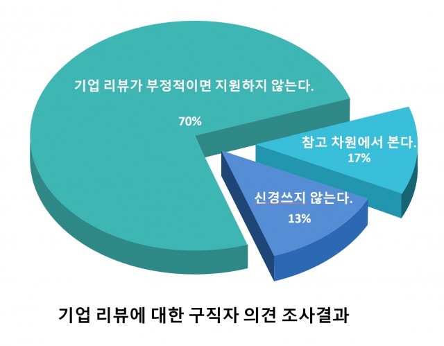 조사에 참여한 구직자 70%가 “기업 리뷰 웹사이트에 등록된 기업 평가 글을 보고 지원할지를 결정한다”고 답했고, 기업 리뷰를 참고한다고 답한 이들 가운데 20%는 “회사에 대한 부정적인 내용이 있으면 입사 지원을 하지 않거나 채용 진행을 중단했다”고 응답했다.