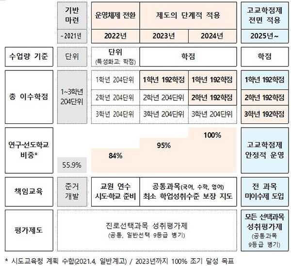 이에 따라 교육부는 2025년 학생 맞춤형 교육체제의 완전한 안착을 목표로, 고교학점제의 단계적 이행은 2021년 기반 정비를 거쳐 2022년부터 이뤄지도록 할 계획이다.