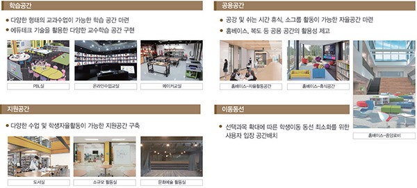 올해는 전체 일반계고의 45%에 고교학점제 운영을 위한 공간 조성이 완료됐으며, 학생 맞춤형 교육과정과 연계해 학교공간의 다양화 및 복합화를 진행하고 있다.