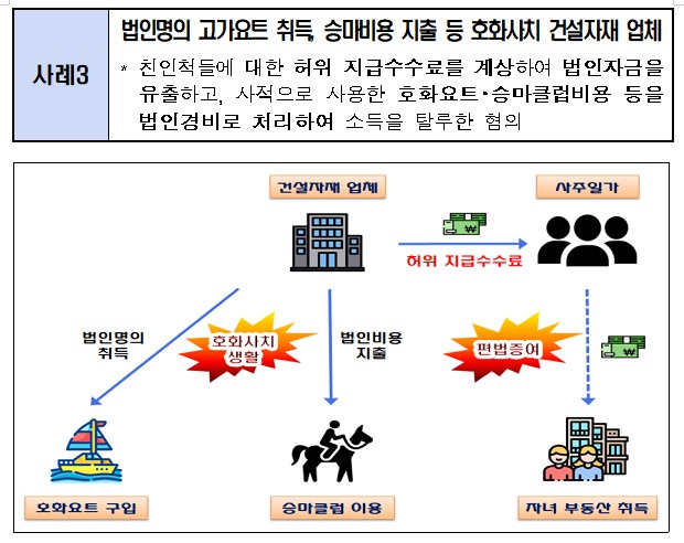 국세청은 사주가 법인명의로 업무와 관련 없는 호화 요트(10억 원), 슈퍼카(5대 10억 원), 고가 명품시계 등(3억 원)을 구입해 사적으로 사용하고, 고액의 승마비용(1억 원 이상)을 법인경비로 변칙 처리한 혐의 등을 확인했다.