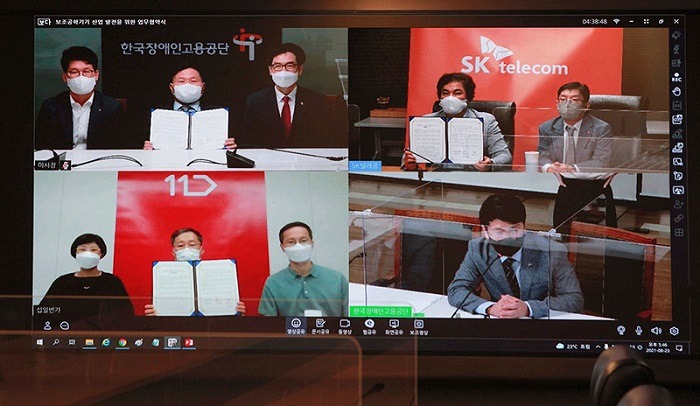 SK텔레콤, 한국장애인공단, 11번가는 지난 23일 업무 협약식을 하고 각 기관의 경험과 기술 역량을 공유해 ICT 기반 장애인 근로자들의 업무환경에 필요한 보조공학기기 지원사업을 위해 힘을 모으기로 했다.