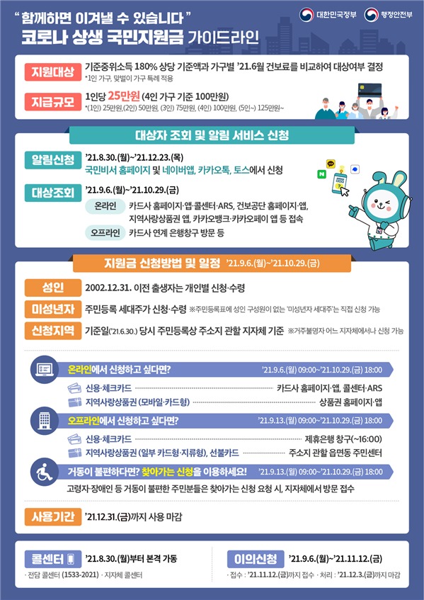 국민지원금 지급 대상 여부는 9월 6일(월) 9시부터 카드사 홈페이지·앱·콜센터·ARS, 건강보험공단 홈페이지·앱 등에서 조회할 수 있다.