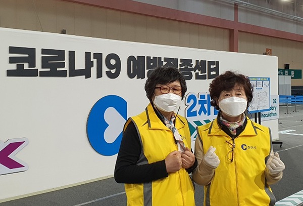 올해 4월부터 운영을 시작한 코로나19 예방접종센터에서는 춘천시 자원봉사센터 김봉자 씨를 쉽게 찾을 수 있다.