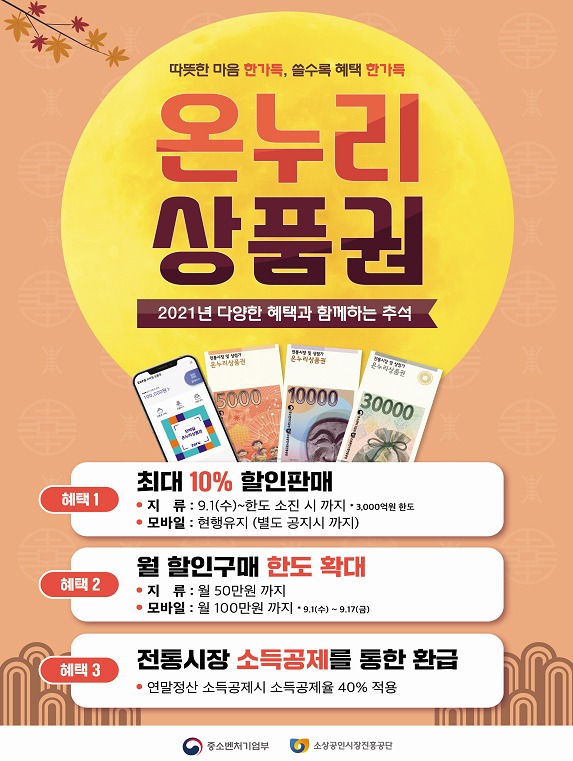 중소벤처기업부는 9월 1일부터 17일까지 온누리상품권 특별판매를 실시한다고 31일 밝혔다.