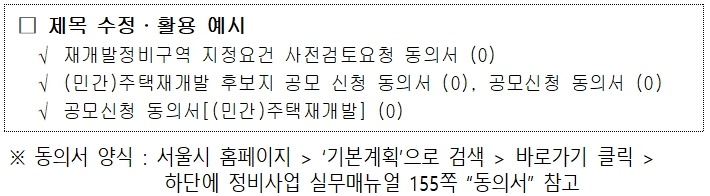 또한, 시는 지난 번 발표 이후 공공기획을 통한 민간재개발에 대한 관심이 높아지면서 일부 지역에서 자체적으로 공모 동의서를 징구하고 있다는 민원을 입수하고, 현장의 혼선을 줄이기 위해 동의서 인정기준과 주의사항을 각 자치구 정비사업 부서에 전달(8.23.)했다.