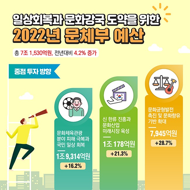 문체부는 ▲문화·체육·관광 분야 피해 극복과 국민 일상회복 ▲신한류 진흥과 문화·체육·관광 산업 미래시장 육성 ▲ 문화균형발전 촉진 및 문화향유 기반 확대라는 3가지 기조를 최우선으로 고려해 내년도 예산을 편성했다고 밝혔다.