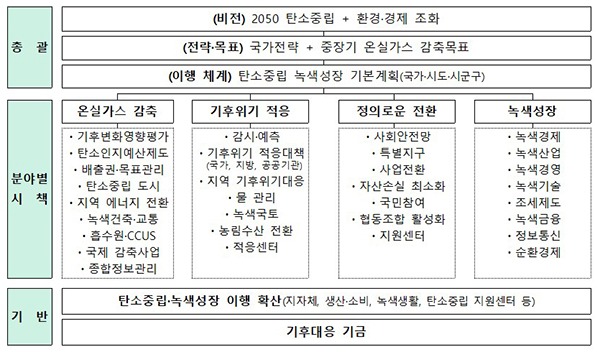 아울러 탄소중립을 이행하기 위해 국가 주요 계획과 개발사업 추진 때 기후변화 영향을 평가하는 기후변화영향평가제도와 국가 예산계획 수립 때 온실가스 감축목표를 설정·점검하는 온실가스감축인지예산 제도를 도입했다.