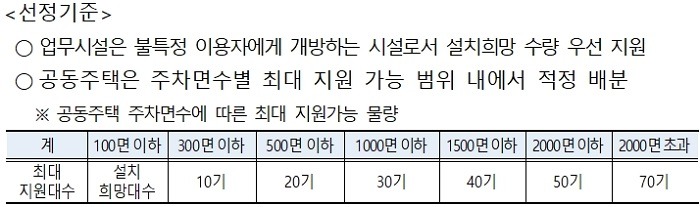서울시는 설치를 희망하는 294개소 모든 곳에 골고루 전기차 콘센트형 충전기를 설치한다는 목표 아래 균형 있게 물량을 배분했다. 업무시설은 불특정 이용자가 이용하는 만큼 우선 지원한다. 공동주택의 경우 주차면수별로 최대 지원 가능 범위 내에서 적정하게 배분했다.