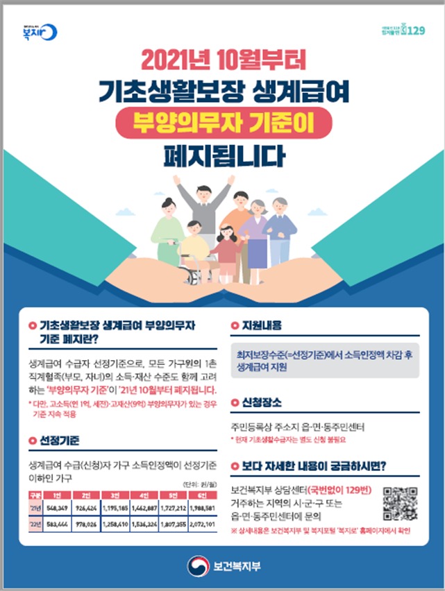 ‘기초생활보장제도 생계급여 부양의무자 기준 폐지’에 따른 상담 및 신청은 주소지 읍면동 행정복지센터에서 가능하며, 관련 문의는 129 보건복지상담센터를 통해서도 안내받을 수 있다.