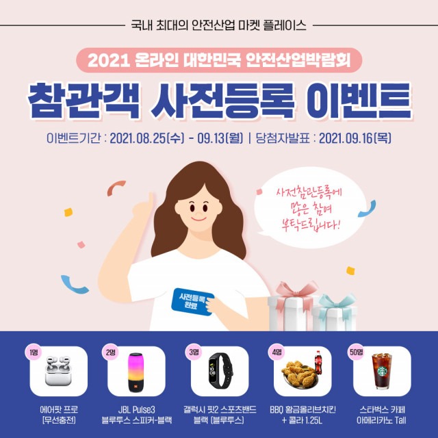 온라인 관람객들의 재미를 더할 수 있도록 누구나 참여 가능한 이벤트도 눈길을 끈다. 9월 13일까지 박람회 공식 페이스북에서 진행되는 참관객 사전등록 이벤트는 사전참관만 등록해도 이벤트 응모가 가능하다. 총 60명을 선정해 에어팟 프로, JBL 블루투스 스피커 등 풍성한 경품을 증정하며, 이벤트 게시물에 참여 완료 댓글을 남기고, 친구를 태그하면 당첨 확률이 더 높아진다. 당첨자 발표는 9월 16일이며, 온라인 플랫폼에 등록한 참관객 중 추첨을 통해 다양한 경품을 제공할 예정이다.