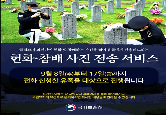 국립묘지 의전단이 유족들의 요청을 받아 직접 수행하는 ‘헌화·참배 사진전송 서비스’도 시행한다. 이는 유족을 대신해 국립묘지 의전단이 고인이 되신 국가유공자에게 헌화·참배하는 사진을 찍어 유족에게 전송하는 것으로, 8일부터 17일까지 전화 신청한 유족을 대상으로 진행될 예정이다.