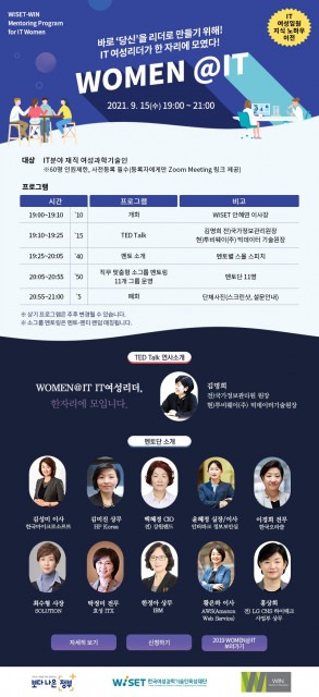 한국여성과학기술인육성재단(이하 WISET)는 9월 15일(수) 오후 19시 IT 분야 여성 재직자 대상 온라인 멘토링 프로그램 ‘WOMEN@IT’를 개최한다.