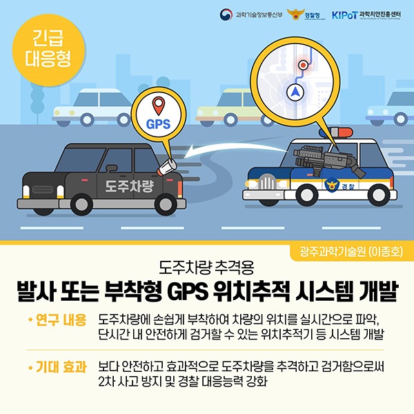 먼저 도주차량 추격 때 발사형 위치추적기를 활용한 안전 추격시스템과 사회적 약자 보호 등 순찰업무 지원을 위한 무인 순찰 로봇 시스템, 치안현장에 출동하는 경찰관을 위한 안전성과 편리성을 갖춘 방패와 보호복을 개발한다.