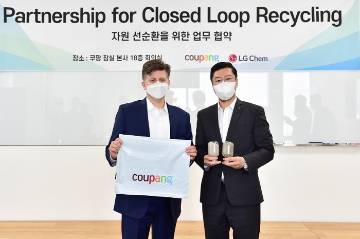 LG화학은 9일, 서울 잠실 쿠팡 본사에서 LG화학 허성우 부사장과 쿠팡 라이언 브라운(Ryan Brown) 부사장 등 양사 경영진이 참석한 가운데 ‘플라스틱 재활용 및 자원 선순환 생태계 구축’을 위한 업무협약(MOU)를 체결했다고 밝혔다.