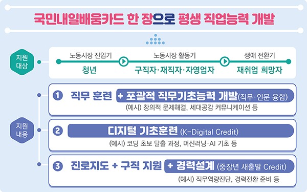 이번 방안에서는 국민내일배움카드 발급 대상을 대학 3학년 등까지 확대하고, 중장년에게는 훈련 이외에 경력개발 컨설팅 비용도 추가 지원하는 등 중장년 새출발 크레딧(Credit)을 도입하기로 했다.