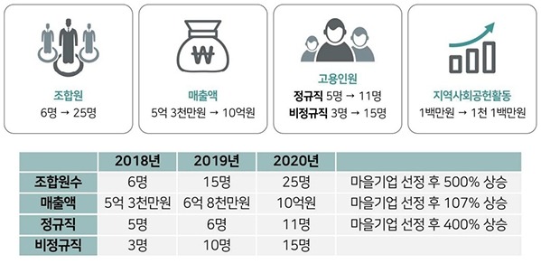 이 결과 2018년에 단 6명의 조합원 수는 이듬해에 15명으로, 그리고 지난해에는 25명으로 늘어났고 매출액 또한 마을기업 선정 후 그동안 107% 상승을 달성했다.