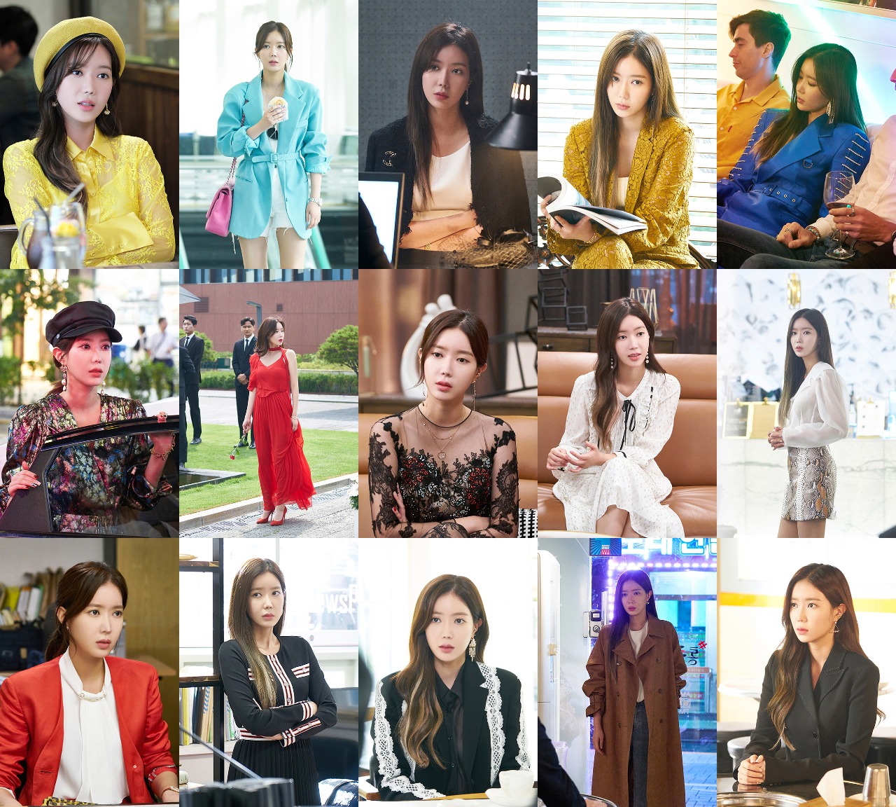 ‘우아한 가’에서 임수향은 비비드 컬러의 다양한 스타일을 선보인다. 쨍한 노란 베레모 룩을 비롯하여 민트 오버핏 쟈켓, 클럽용 블루 미니 쟈켓 원피스까지. 거기다 대비되는 컬러의 미니백, 시선을 잡아 끄는 쥬얼리를 매치하여 재벌 상속녀 모석희 룩을 완성한다. 이러한 비비드 컬러 의상들은 어디로 튈 지 모르는 당당하고 강한 의지의 모석희 캐릭터를 완성시키며 여심 저격 아우라를 내뿜었다.