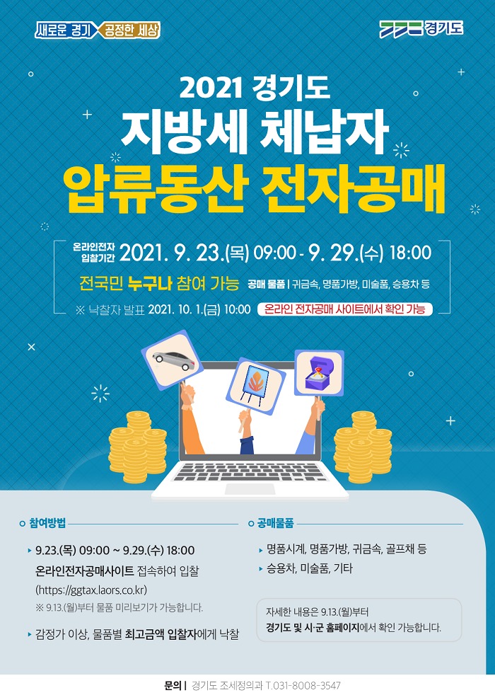 한편, 경기도는 지난해 10월 전국 최초 비대면 온라인 전자공매를 통해 410건의 압류물품을 매각하고 총 4억6,000만 원의 체납액을 징수했다.