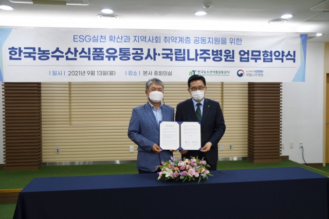 국립나주병원은 한국농수산식품유통공사(이하 aT)와 ‘ESG 실천문화 확산 및 지역사회 상생을 위한 업무 협약’을 체결했다고 13일 밝혔다.