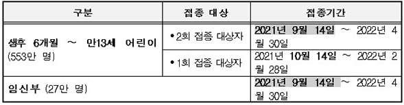 14일부터는 2회 접종이 필요한 어린이와 임신부를 대상으로 시작되고, 1회접종 대상 어린이는 오는 10월 14일부터 시작한다.