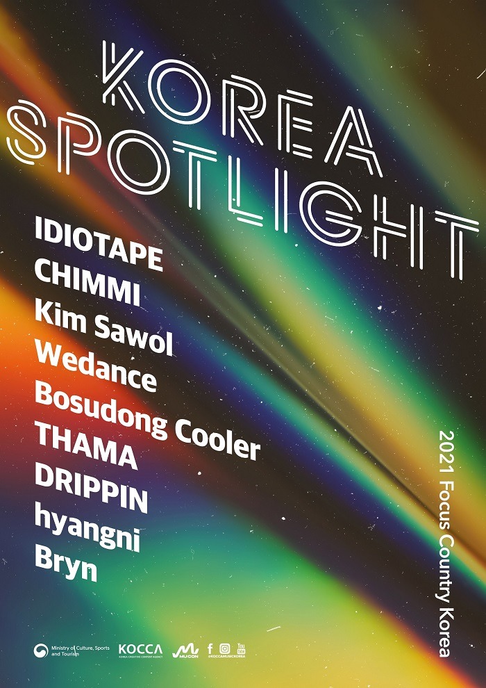 콘진원은 K팝 쇼케이스 ‘코리아 스포트라이트(Korea Spotlight)’를 진행하며, ▲드리핀 ▲브린 ▲이디오테잎 ▲김사월 ▲따마 ▲향니 ▲위댄스 ▲취미 ▲보수동쿨러 등 국내 뮤지션 9개 팀을 선보인다. 주빈국으로서 예년보다 확대된 규모로 뮤지션 소개에 나서며, 뮤지션들의 특색을 살린 쇼케이스 영상을 통해 K팝의 다양한 매력을 알린다.