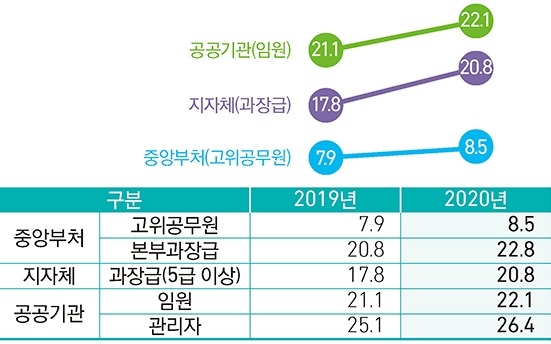 한편 5급 이상 지방 과장급 여성 비율은 20.8%로 전년 대비 3%p, 기관장·이사·감사 등 공공기관 임원의 여성 비율은 22.1%로 전년 대비 1%p 증가했다.