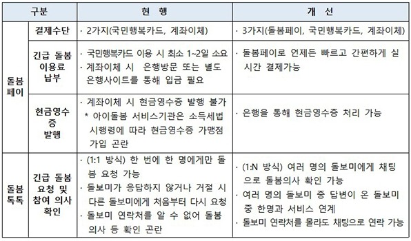 이번에는 ‘돌봄페이’와 ‘돌봄톡톡’ 서비스를 개시해 지난 10여개월 동안 운영한 ‘일시연계서비스’ 결제 불편사항을 해결하고, 긴급 돌봄 요청 시 아이돌보미들이 응답하지 않는 경우 등을 개선할 계획이다.