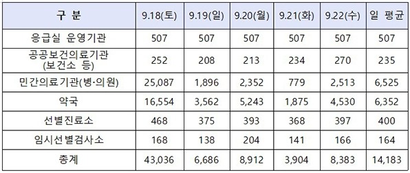 또한 전국 507개 응급실 운영기관과 시설은 평소와 다름없이 24시간 진료를 하며, 보건소 등 공공보건의료기관과 병·의원 등 민간의료기관도 일평균 235곳과 6525곳이 운영을 한다.