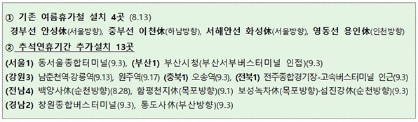 버스터미널과 기차역, 휴게소 중심으로 총 17곳의 임시선별검사소를 운영하는데, 기존에 운영하던 경부선 안성휴게소 등 4곳은 연장운영하면서 연휴기간을 대비해 13곳을 추가했다.