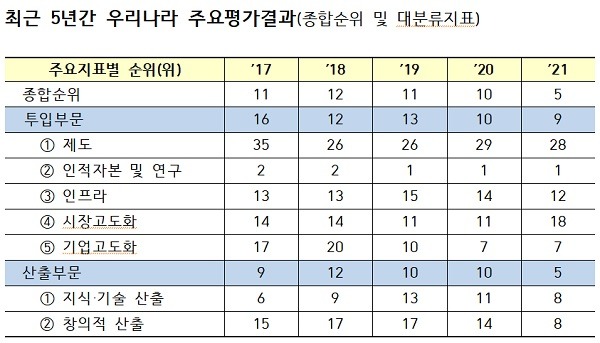 우리나라는 제도, 인적자본·연구, 인프라, 시장 고도화 등 투입부문 5개, 지식·기술 산출, 창의적 산출 등 산출부문 2개 등 모두 7개의 평가분야 가운데 미래에 대한 투자를 평가하는 인적자본·연구 분야에서 3년 연속 세계 1위를 지켰다.