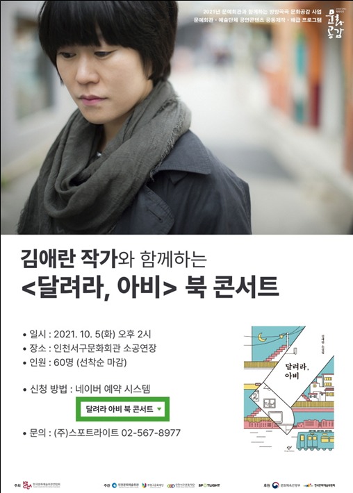인천광역시는 오는 10월 5일 인천 지역 3개 극장에서 개최되는 연극 [달려라, 아비]의 초연을 기념해 개최되는 북 콘서트에서 인천 출신의 원작자인 김애란 작가가 직접 관객들과 만나 소설가의 삶과 원작에 관한 이야기를 들려줄 예정이라고 밝혔다.